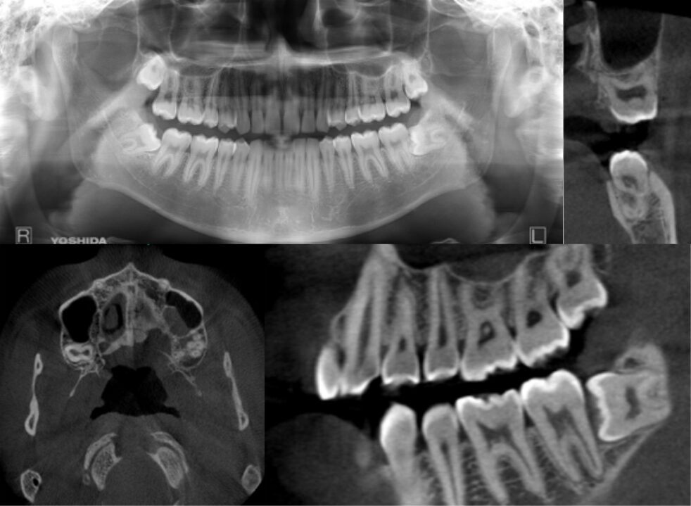 水平断にて4根 冠状断・矢状断にて根の離開、彎曲が大きく特異的な形態の症例